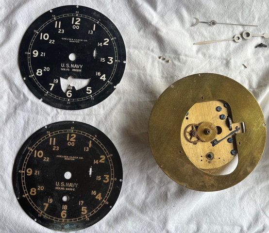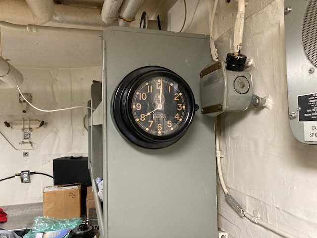 Thanks to a generous donation by Stuart Hansen, W6MG of Palo Alto, CA., the WWII vintage radio shack now has a Navy Deck Clock/with wind up key dated 1943. The clock was manufactured by Chelsea Clock Company of Boston which was founded in 1897. History of the company can be found here. The clock was installed in our WWII compartment by club members Rick Current AE4IX & Marty Harpen KK4RF.