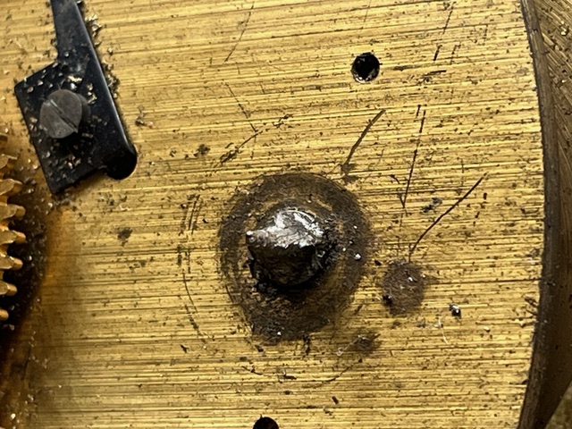 The club also has a second Chelsea deck clock of the same model. It is not in working condition (it requires a new main spring). It will be installed in the modern radio operating space as a static display. It was donated by Brian Harrison, KN4R of Sherrills Ford, NC. The clock had a damaged faceplate and Brian sent a spare faceplate for a replacement. Club member Rick Current AE4IX replaced the faceplate. Unfortunately the key winding shaft, which is part of the main spring is rounded off.