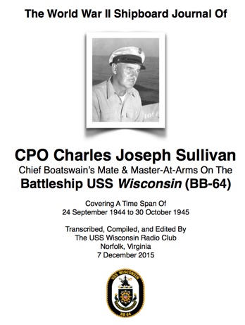CPO Charles Joseph Sullivan was Chief Boatswain’s Mate and Master-At-Arms onboard the Battleship USS Wisconsin (BB-64) for the duration of the ship’s involvement in World War II. He kept a meticulous daily journal of all of the onboard activities that he observed. This book contains a transcript of his entire journal with key events annotated, including photographs from his personal collection. His journal starts when the Wisconsin departed the Philadelphia Naval Shipyard. After transiting the Panama Canal, the Wisconsin steamed to Pearl Harbor and beyond into some of the most important naval engagements of the war. CPO Sullivan saw his ship attacked by Japanese aircraft, including Kamikazes. The Wisconsin bombarded Formosa, Luzon, Okinawa, and the Japanese mainland. Sullivan was there the whole time – 105,831 miles worth and 1,562 sixteen-inch shells fired – from the day the Wisconsin was commissioned until the day she dropped anchor in Tokyo Bay at war’s end. It’s documented here, in his own words.